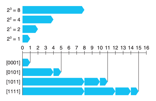 B2U4([0001]=0⋅23+0⋅22+0⋅21+1⋅20=0+0+0+1=1B2U4([0101])=0⋅23+1⋅22+0⋅21+1⋅20=0+4+0+1=5