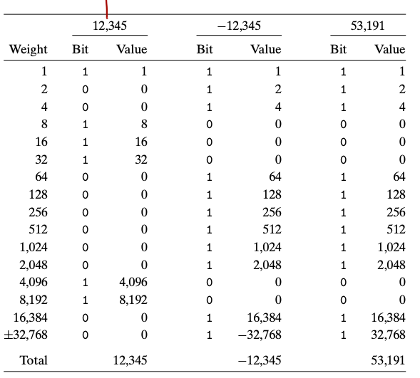 The following table gives the two’s complement representation of and , and the unsigned representation of . Notice that the bit pattern of and are identical.
