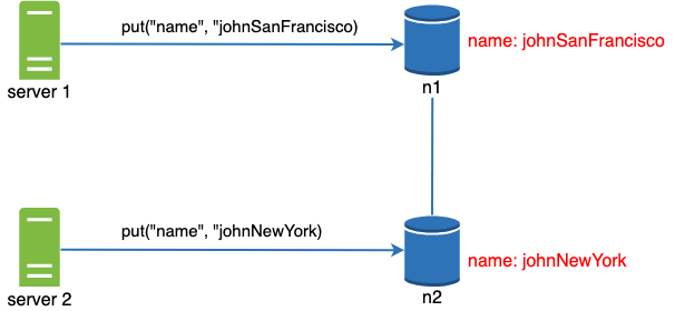 Here, when the client reads and , it will discover a conflict (caused by being modified by and ). The conflict is resolved by client and updated data is sent to the server. Assuming that the write is handled by , we end up with