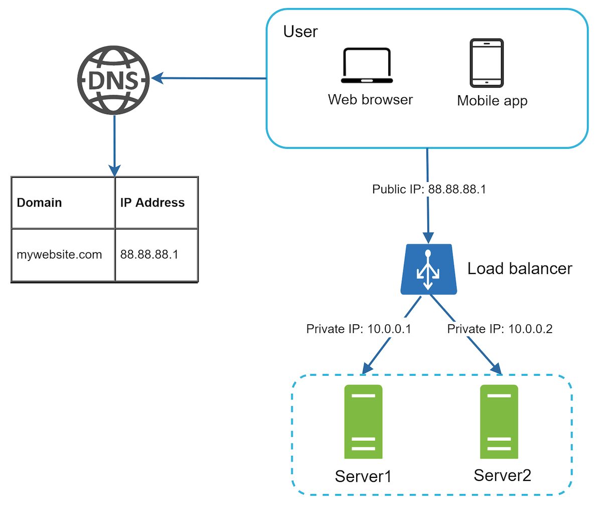 - Users will send requests to the public IP of the load balancer, which in turn will decide which server to forward the request to